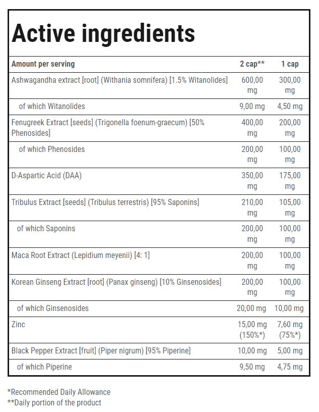 - Herbal Extracts: A carefully selected blend of plant extracts to support overall vitality, physical performance, and recovery.